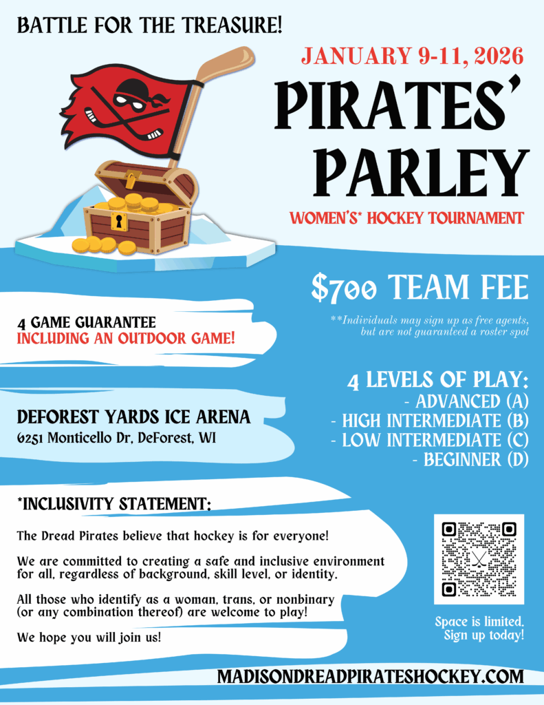 Back by popular demand, the Madison Dread Pirates are hosting our second annual Pirates Parley Tournament! This will be an Adult Women’s* Hockey Tournament with divisions for every skill level.